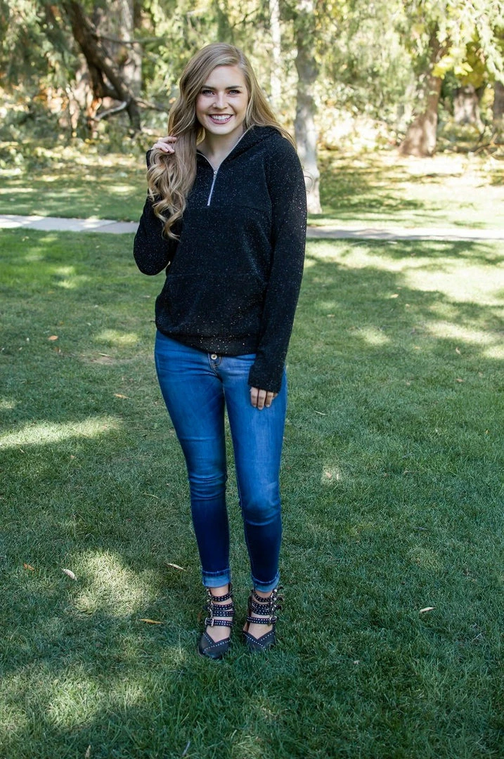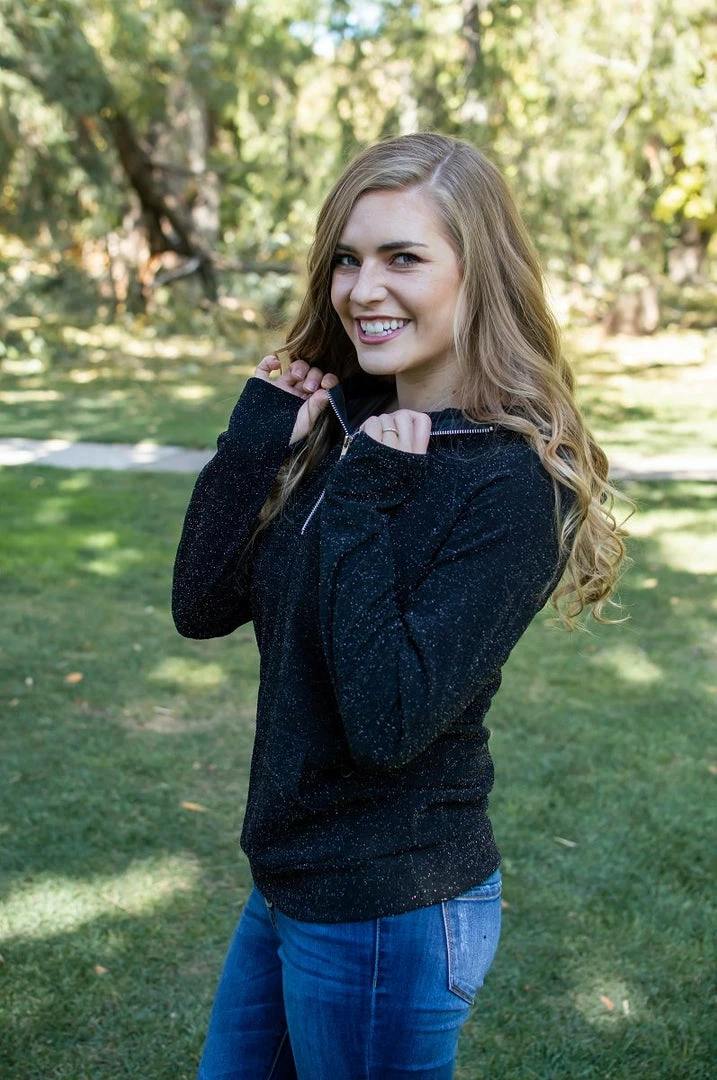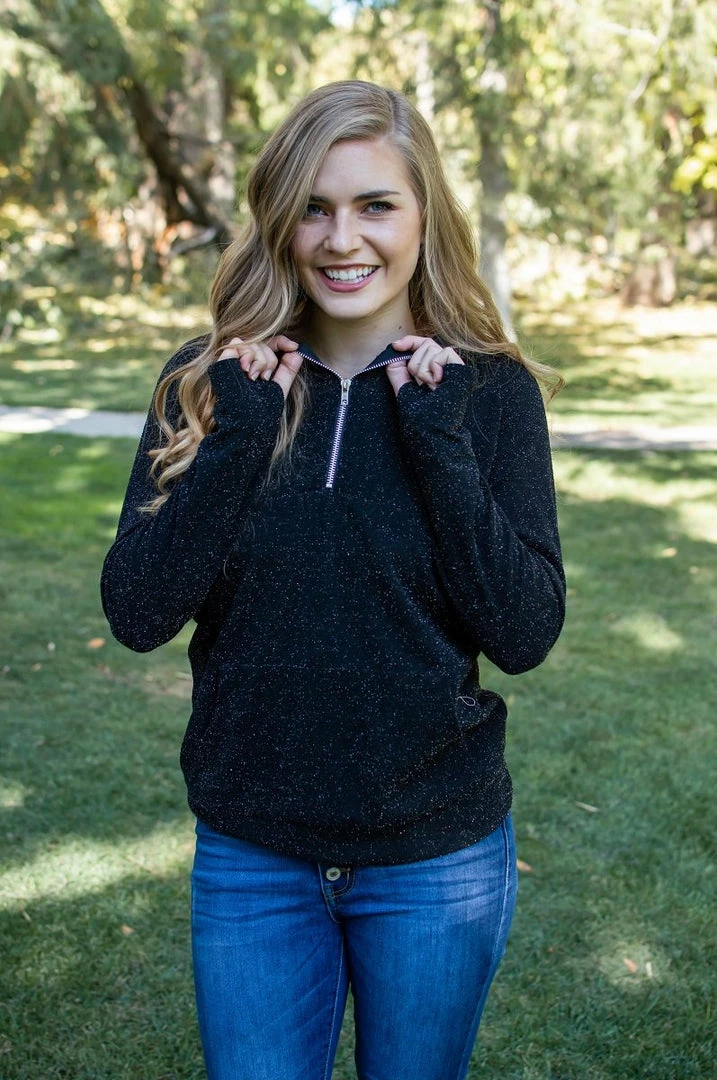 Girl, 2022 is your time to shine! Bring on the Holidays in this GORGEOUS shimmer half-zip hooded pullover. This shimmer fabric is perfect for all those holiday parties and for everyday wear! And don’t worry! It’s not scratchy on the inside!