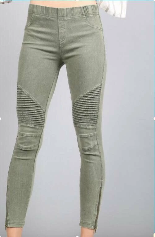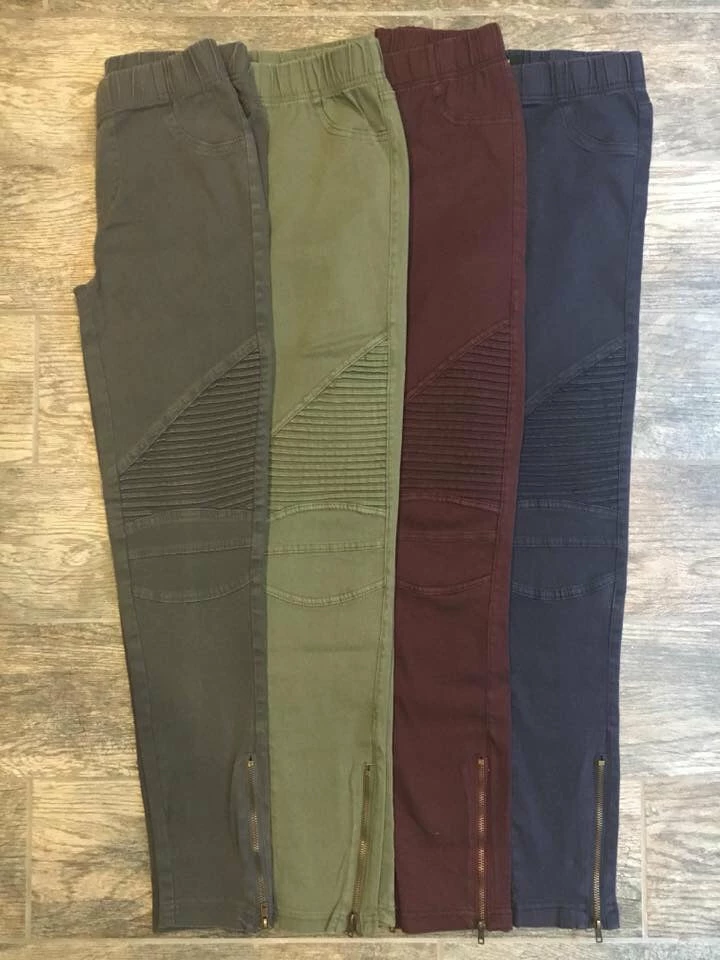 The Moto Leggings. I have these bad boys available in olive, midnight blue, wine and dark gray. They come in small (0-2), medium (4-6) and large (8-10). If you’re in between sizes I would size up. The run a little smaller than true to size. 97% cotton 3% spandex.ย