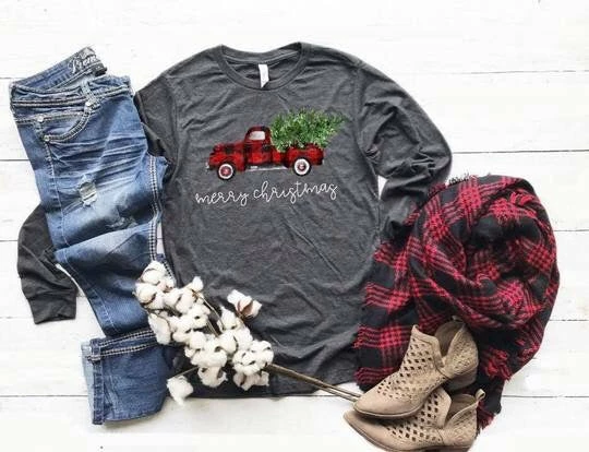The βTis the Season Top. This long sleeved charcoal top is so adorable with the old fashioned truck hauling the tree. Itβs 52% cotton and 48% polyester. Slight relaxed fit unisex tee.Β